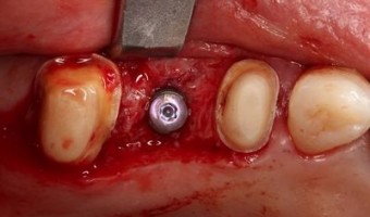 右上第二小臼歯部分にインプラントを埋入します。写真は外した状態ですが治療中は暫間的にプラスチックの仮歯ブリッジをセットしています。 インプラント床(インプラントを埋入する穴)の形成を終えました。オステオトームでソケットリフト(...