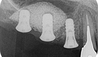 ※外科処置の写真が含まれますのでご注意ください。本日の午後は右上のインプラントオペを行います。 CT画像です。右上第一大臼歯は根尖病変と歯根肥大がみられ挺出による重度の位置異常があるためオペ時に抜歯し3本のインプラントでインプラントブリ...