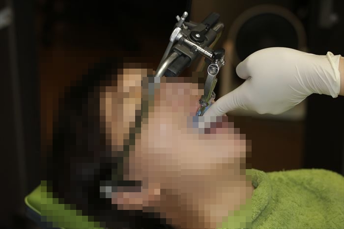 フェイスボウトランスファーを行い顎関節と上顎歯列の位置関係を記録します。