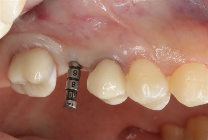 修正が可能な深さまでドリリングして、深度ゲージを挿入してデンタルレントゲン写真を撮影します。