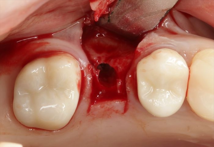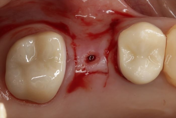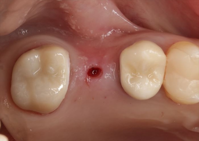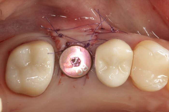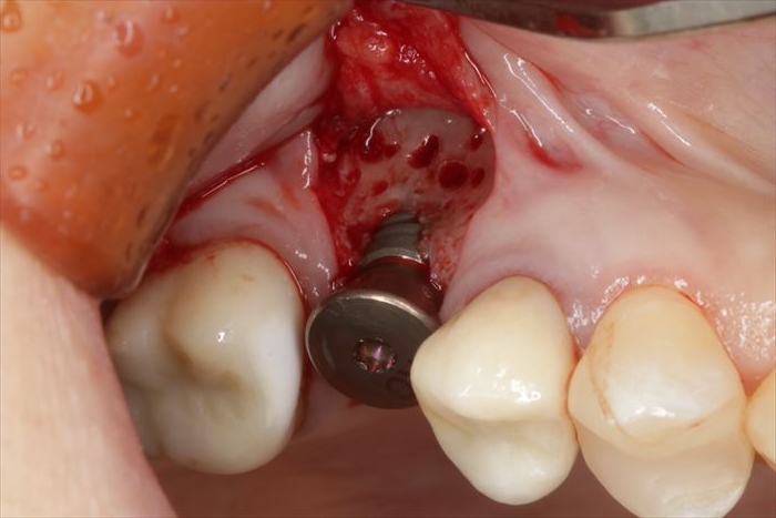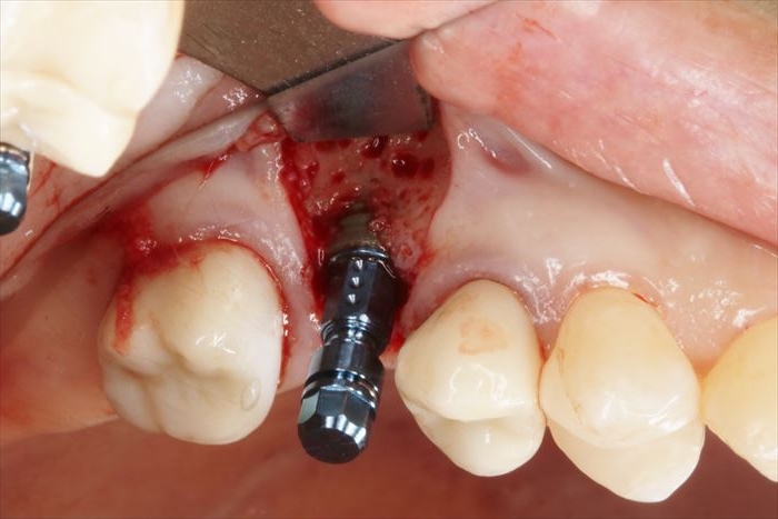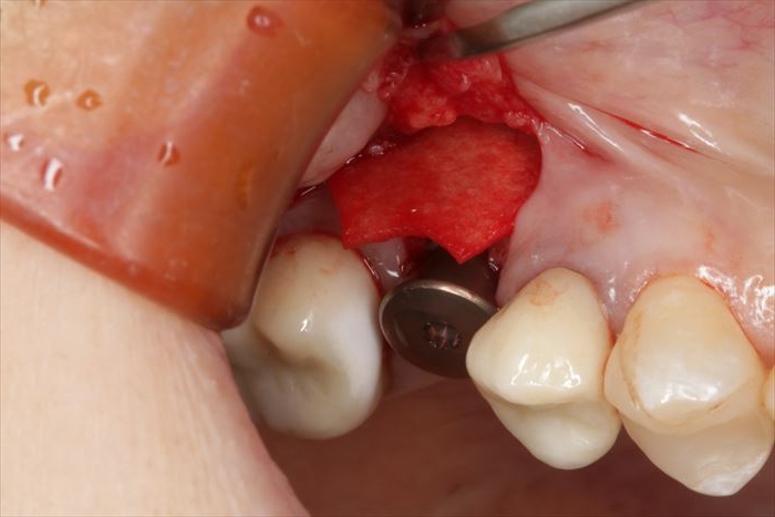 頬側骨が少々足りない状況ですので、インプラント埋入後に骨増生処置(GBR)を行います。