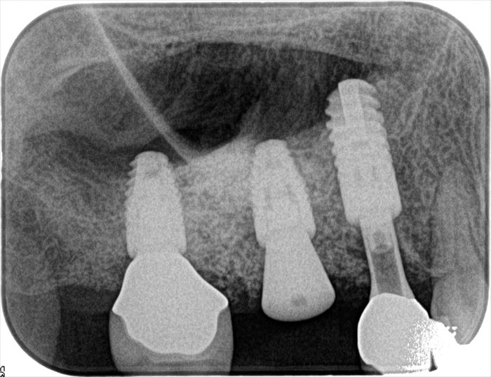 画像左端の右上第二大臼歯部分のインプラント埋入オペ時のデンタルレントゲン写真です。