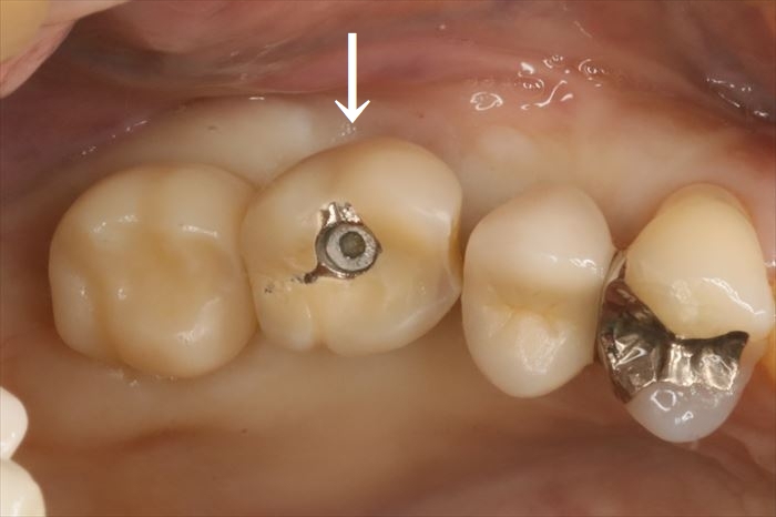 N・Hさんの右上第一大臼歯部分(6┘:右上6)のインプラントの再治療を行います。(矢印)