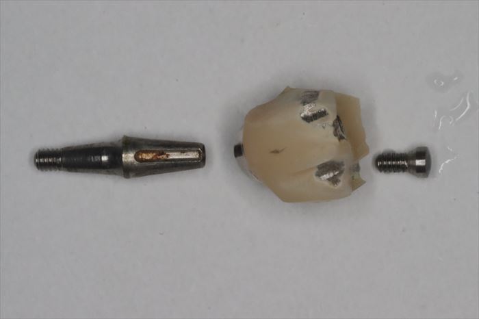 咬合面のスクリューを緩め、まずは被せ物(クラウン)を取り外しました。