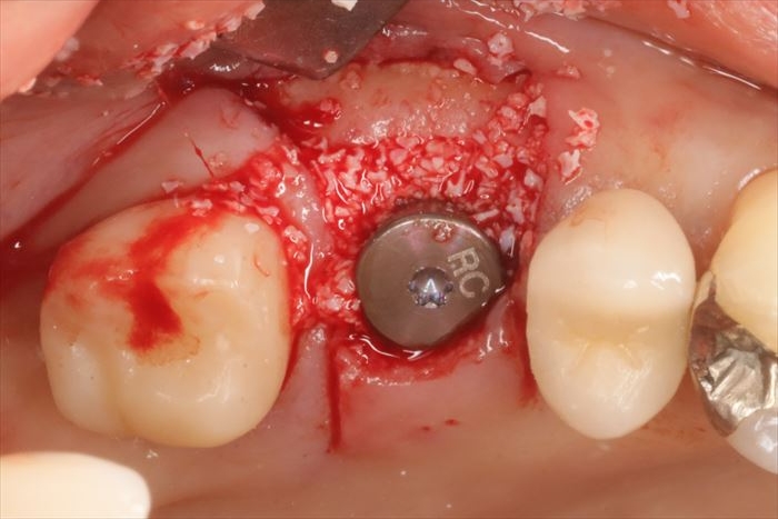 歯ぐきの形態を形成するためのヒーリングキャップを締結し、周囲の骨欠損部分に骨移植材を填入し骨増生します。