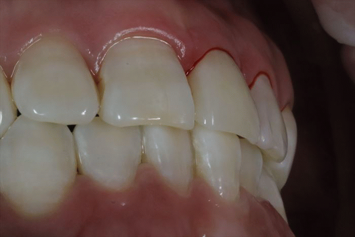 もともとこの歯が折れる原因となった下顎前歯による突き上げとこすれ具合(前方ガイド)を最終確認します。