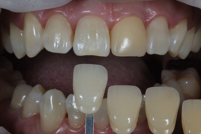 K・Tさんのご希望でホームホワイトニングを終え、明るくなった天然歯の色の採得(シェードテイキング)をしている場面です。