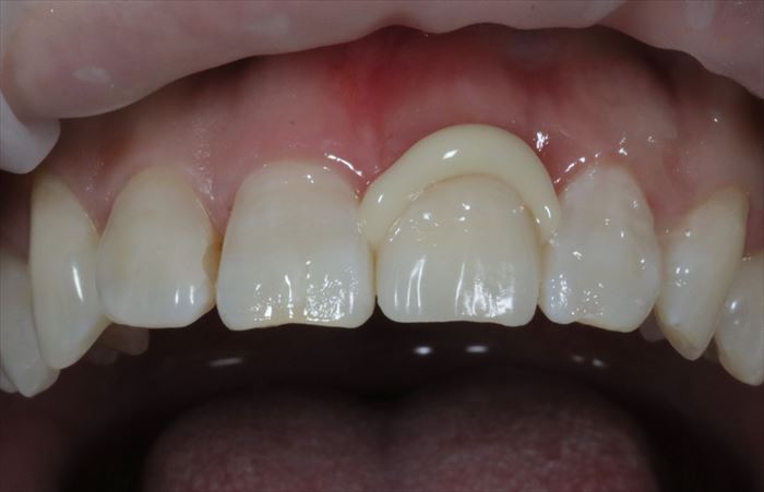 レジンセメントで接着した状態をシミュレーションするためのトライインペーストを使用して留めています。